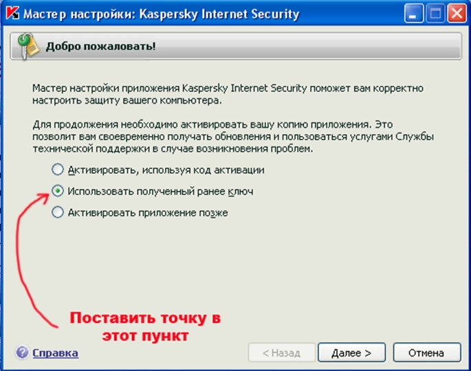 Откроется следующее окошко! В нем нужно поставить точечку в пункт «Использовать полученный ранее ключ»